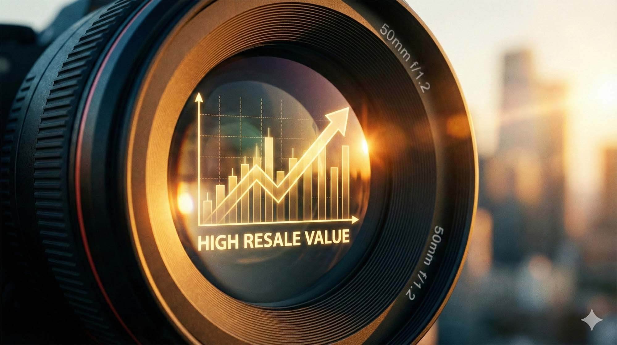 特寫鏡頭前玉反射出上升的圖表曲線,金黃色調打光,象徵單眼相機的高保值性與回收價值 / Close up of a camera lens front element reflecting a rising stock graph, symbolizing high resale value, golden lighting.